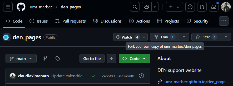 Great, from now on, in our Github profile will appear added the DEN Pages repository, with a label indicating that it is a Fork from umr-marbec/den_pages. In this fork version we can make changes and edits because it is already inside our account, but at the same time it maintains an internal link with the original repository, which will become important in the following steps.