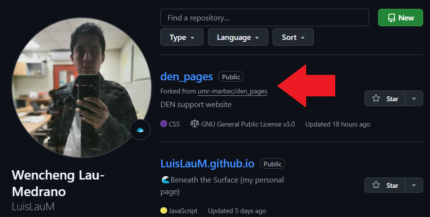 The DEN Pages repository is managed by the Marbec DEN team and they are the only ones authorized to accept, deny or revert any change to the website content. So, being us an external user, the procedure to submit a change or edit request on this repository is first to obtain a copy of the DEN Pages repository in our own Github account.