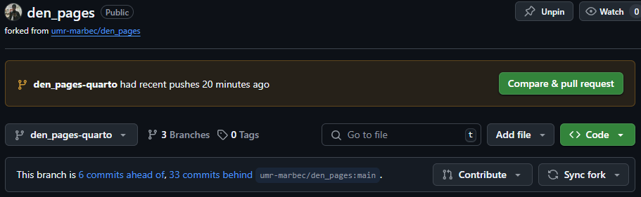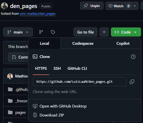 Super, à partir de maintenant, dans notre profil Github apparaîtra le dépôt DEN Pages, avec un label indiquant qu’il s’agit d’un Fork from umr-marbec/den_pages. Dans cette version fork nous pouvons faire des changements et des éditions parce qu’elle est déjà dans notre compte, mais en même temps elle maintient un lien interne avec le dépôt original, ce qui deviendra important dans les étapes suivantes.