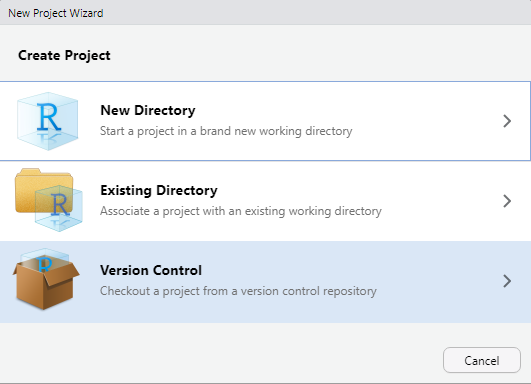In RStudio, it will be enough to go to the menu File→New project. Then, in the window that will open, we will choose the Version Control option, then the Git option and finally in the last window we will paste the URL copied in the previous step and click on the Create Project button.