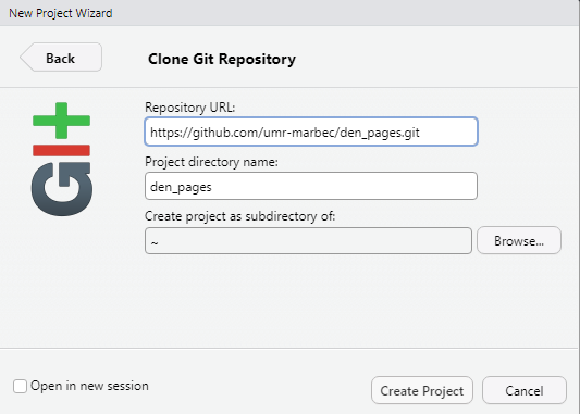 Dans RStudio, il suffira d’aller dans le menu File→New project. Ensuite, dans la fenêtre qui s’ouvrira, nous choisirons l’option Version Control, puis l’option Git et enfin dans la dernière fenêtre nous collerons l’URL copiée dans l’étape précédente et cliquerons sur le bouton Create project.
