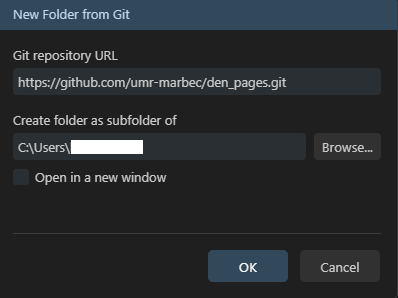 In Positron, it will be enough to go to the menu File→New folder from Git. Then, in the window that will open, paste the URL copied in the previous step. We will be able to choose the folder where we want the project folder to be created (we recommend NOT to leave the default folder, unless we are completely sure that this is the right location) and finally click on OK. Positron will show a small progress window at the bottom and will open the project once the download is finished.