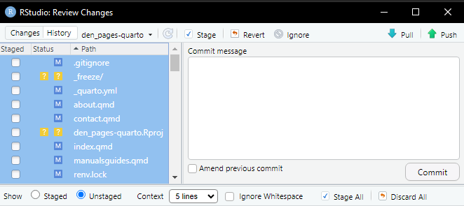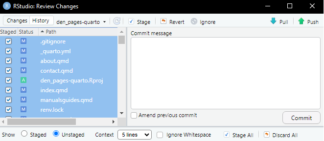 Une fois qu’ils sont tous sélectionnés, cliquez sur le bouton ☑ Stage (en haut), et assurez-vous que TOUS les éléments ont une coche à gauche.