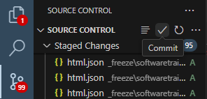 Dans le panneau qui s’ouvre, tous les fichiers ajoutés, édités ou supprimés sont affichés. Nous allons passer le curseur à droite du titre du sous-panneau Source Control et nous verrons qu’un bouton apparaîtra comme une coche. Il s’agit du bouton Commit, sur lequel nous allons cliquer.
