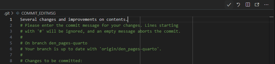 #symbol). Also, the cursor will be positioned on line 1 waiting for us to write a VERY brief description of the changes we have made. The text should be concise (no more than one sentence), but clear enough to give the administrators a hint of the changes made. At the end, click on the check button (✔) at the top of this panel.