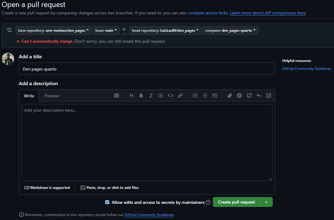 Le dépôt des pages DEN est géré par l’équipe de Marbec DEN (/contact.qmd) et ils sont les seuls autorisés à accepter, refuser ou inverser tout changement au contenu du site web. Ainsi, en tant qu’utilisateur externe, la procédure pour soumettre une demande de changement ou d’édition sur ce dépôt est d’abord d’obtenir une copie du dépôt DEN Pages dans notre propre compte Github.