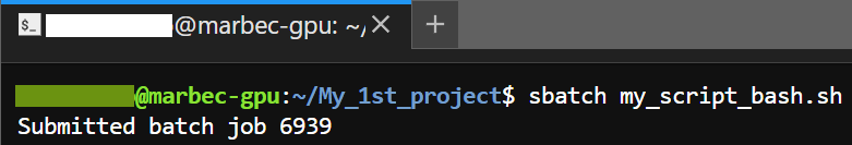 sbatch my_script_bash.shIf everything is set up correctly (i.e., there are no syntax errors in your BASH script), the first thing you will see is a message displaying the Job-ID assigned to your process.