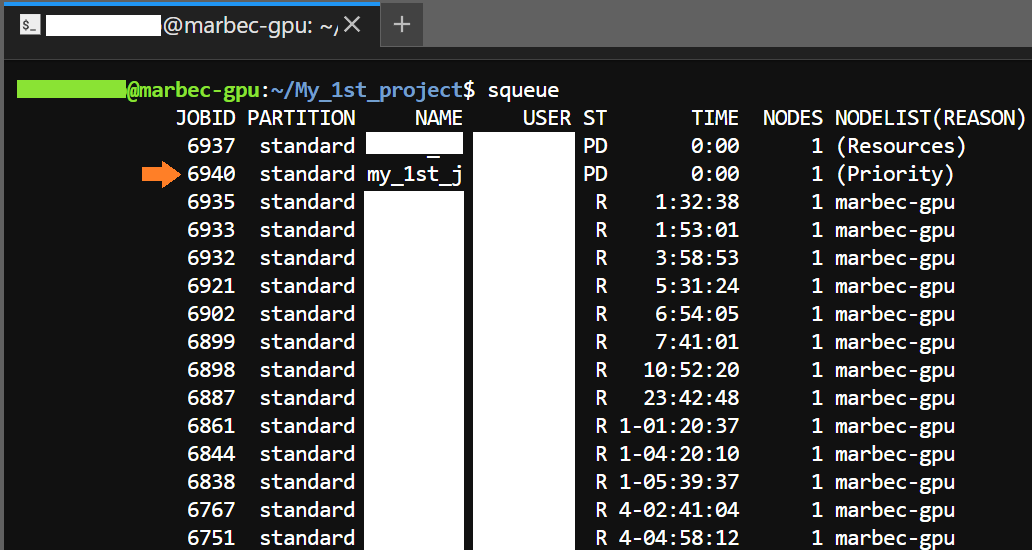 marbec-gpu: Indicates that our process is already running. In theTIMEcolumn we can visualize the time that process has been running in the format DAYS-HOURS:MINUTES:SECONDS. It is important to point out that thespawner-Jupyterhubprocess refers to our own session in Marbec-GPU.(Priority): One or more higher priority jobs is in queue for running. Your job will eventually run.(Resources): The job is waiting for resources to become available and will eventually run.