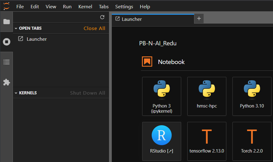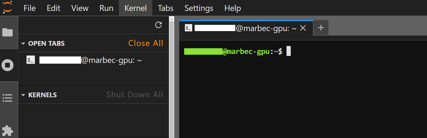 - Open JupyterLab in your browser by going to marbec-gpu.ird.fr.