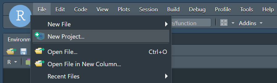 Un nouvel onglet s’ouvrira avec l’interface de RStudio Server, qui est TRÈS similaire à RStudio Desktop, bien que légèrement différente. Sélectionnez File → New Project.