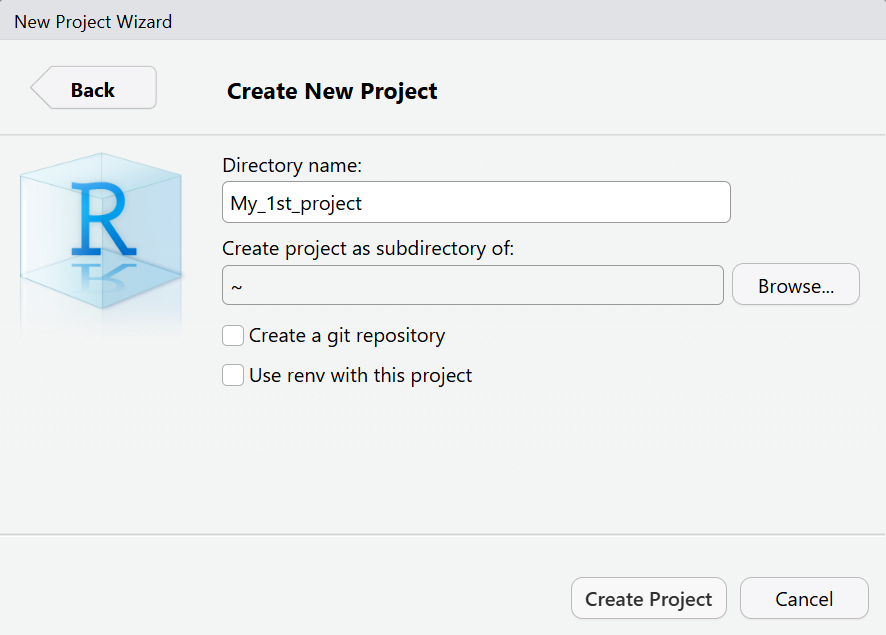 Choisissez New Directory, puis New Project, et enfin, entrez le nom de ce nouveau projet (qui sera également le nom de notre répertoire de travail). Cliquez sur Create Project pour finaliser.